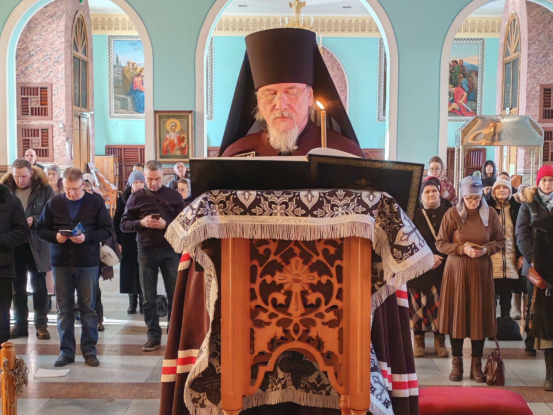 Утром в понедельник 1-й седмицы Великого поста, 23 февраля 2026 года, митрополит Читинский и Петровск-Забайкальский Димитрий молился за уставным богослужением в кафедральном соборе Казанской иконы Божией Матери города Читы — утреней, часами, изобразительными и вечерней. -