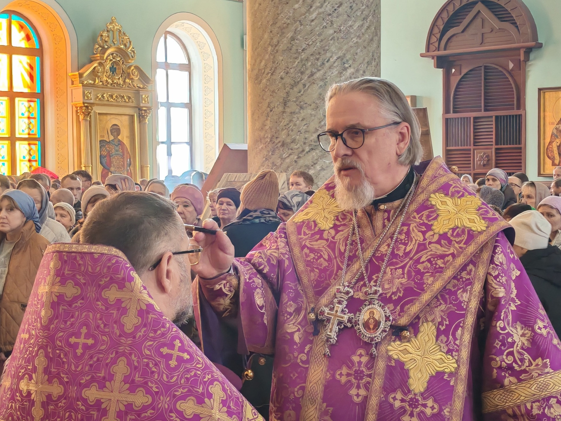 28 марта 2026 года, 5-й седмицы Великого поста. Похвала́ Пресвятой Богородицы. Мч. Ага́пия и иже с ним. Митрополит Читинский и Петровск-Забайкальский Димитрий возглавил Божественную литургию в кафедральном соборе Казанской иконы Божией Матери города Читы. -