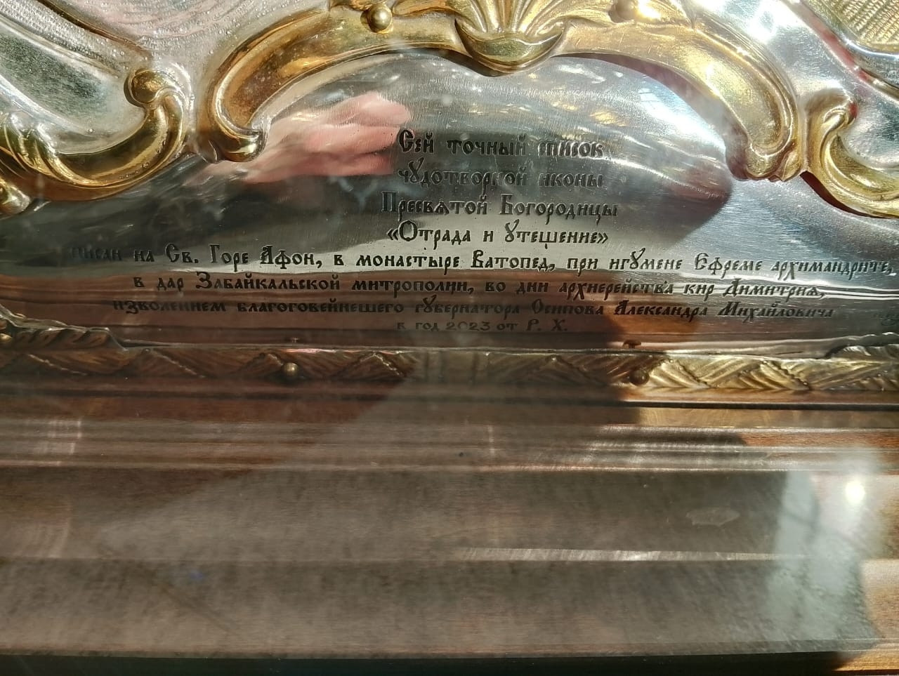 Принесенный список является точной копией чудотворной иконы Божией Матери «Отрада и Утешение» хранящейся в Ватопедском монастыре Афона. Образ написан на Афоне специально для Забайкальской митрополии и преподнесен в дар благодетелями.