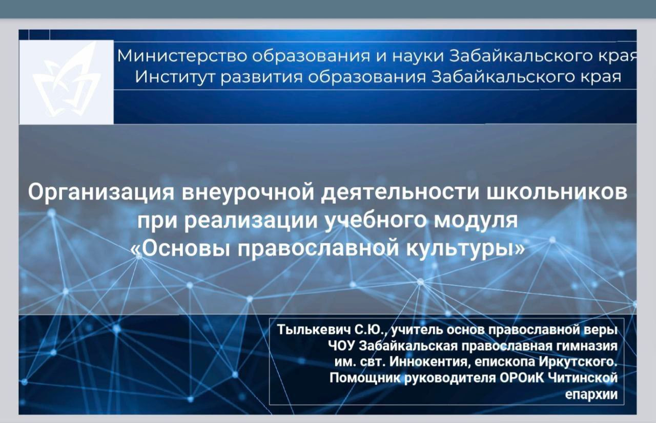 27 мая помощник руководителя Отдела религиозного образования и катехизации Читинской епархии Тылькевич Светлана Юрьевна провела вебинар для учителей «Основы православной культуры» Забайкальского края.