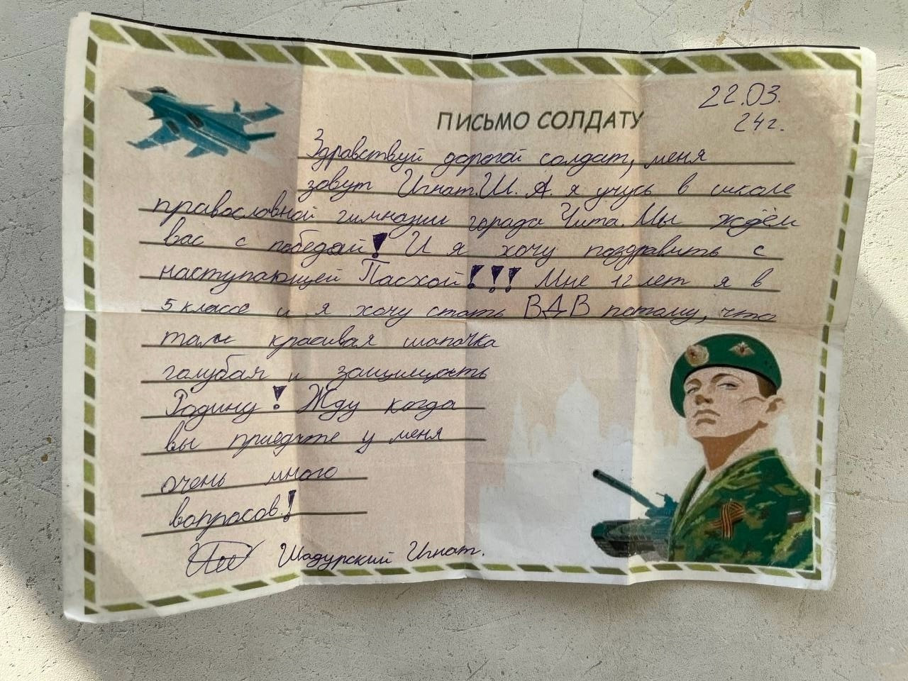 Особенным моментом стало вручение подарка ученику — автору письма, которое нашли в зоне проведения специальной военной операции. Это письмо стало символом связи между фронтом и тылом. Боец, к которому попало письмо, был рад встретиться с автором и вручить ему подарки – головной убор десантника и тактическую сумку.🖋