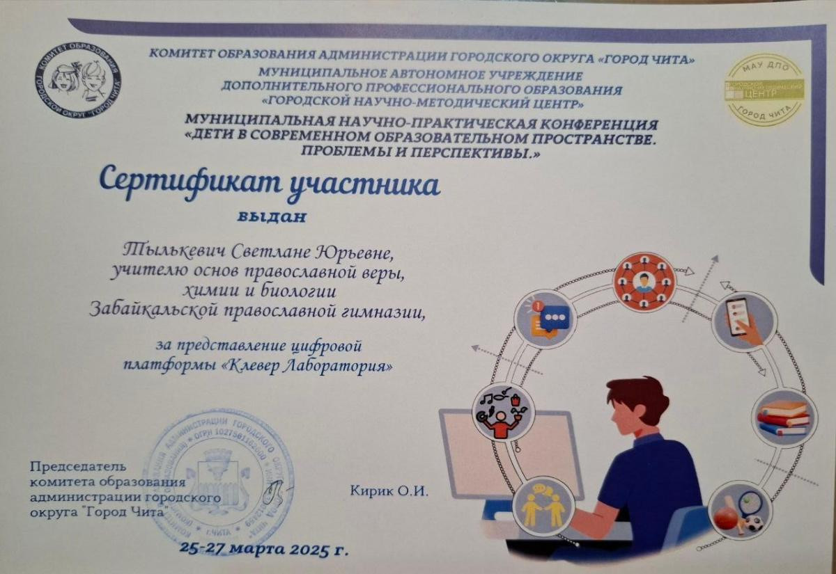 Также активное участие в работе круглого стола приняли преподаватели Забайкальской православной гимназии: Тылькевич С. Ю., учитель основ православной веры, химии и биологии, которая представила презентацию цифровой платформы «Клевер Лаборатория»; учитель начальных классов Номоконова А. А., с темой выступления: «Роль притчи в духовно-нравственном развитии и воспитании ребенка».