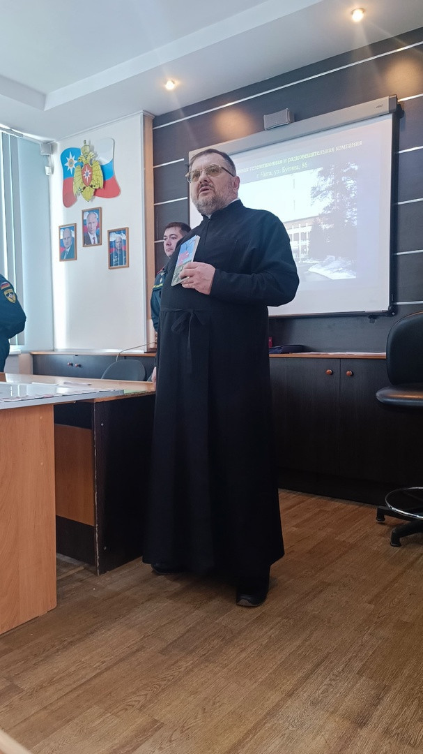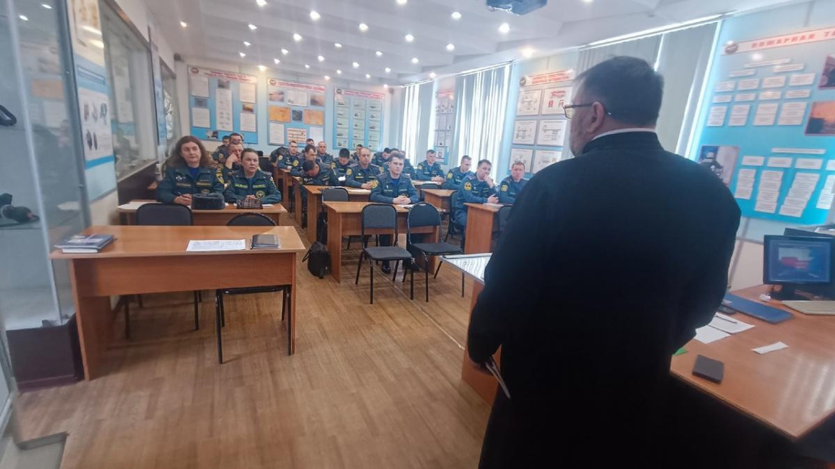 Священнослужитель, в рамках Дня православной книги, рассказал спасателям о празднике и провёл лекцию «Книга, как основа воспитания любви к Родине».