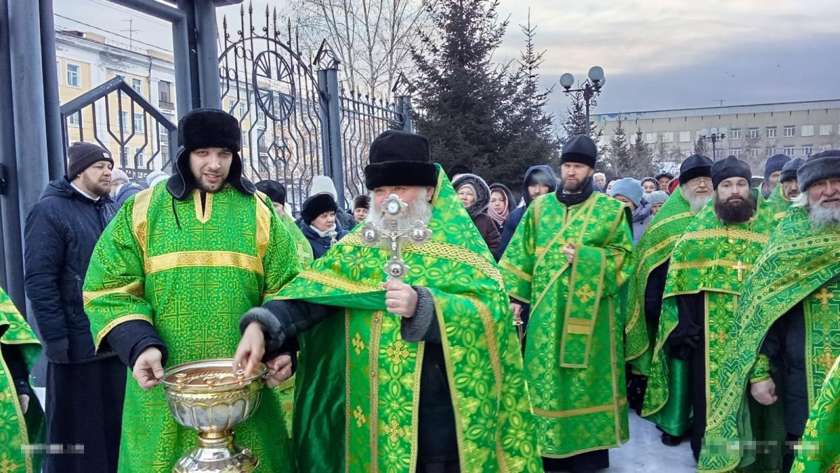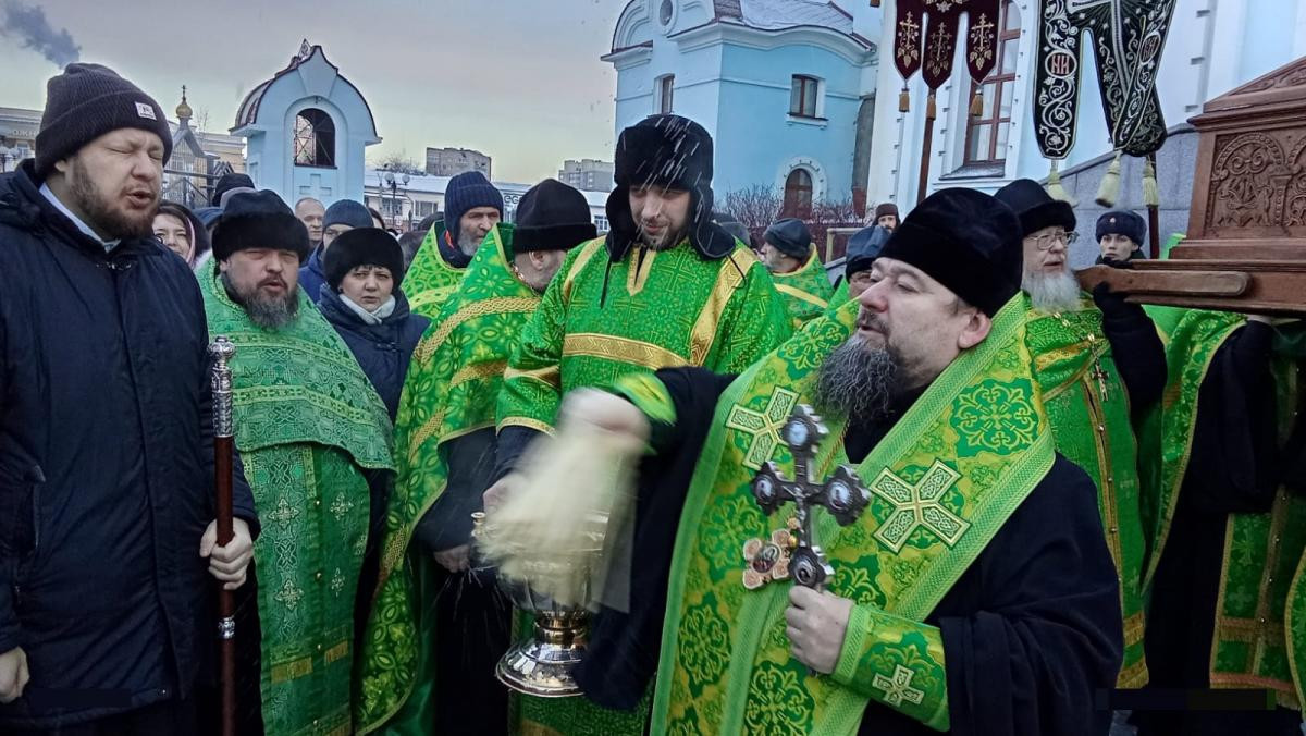 В этот день глава Забайкальской митрополии благословил бригаду иконописцев на дальнейшую роспись Казанского кафедрального собора в Чите и окропил всех святой водой.