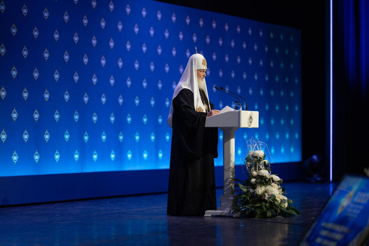 Святейший Патриарх Кирилл, председатель Международных Рождественских чтений, выступил с основным докладом перед участниками торжественного собрания.
