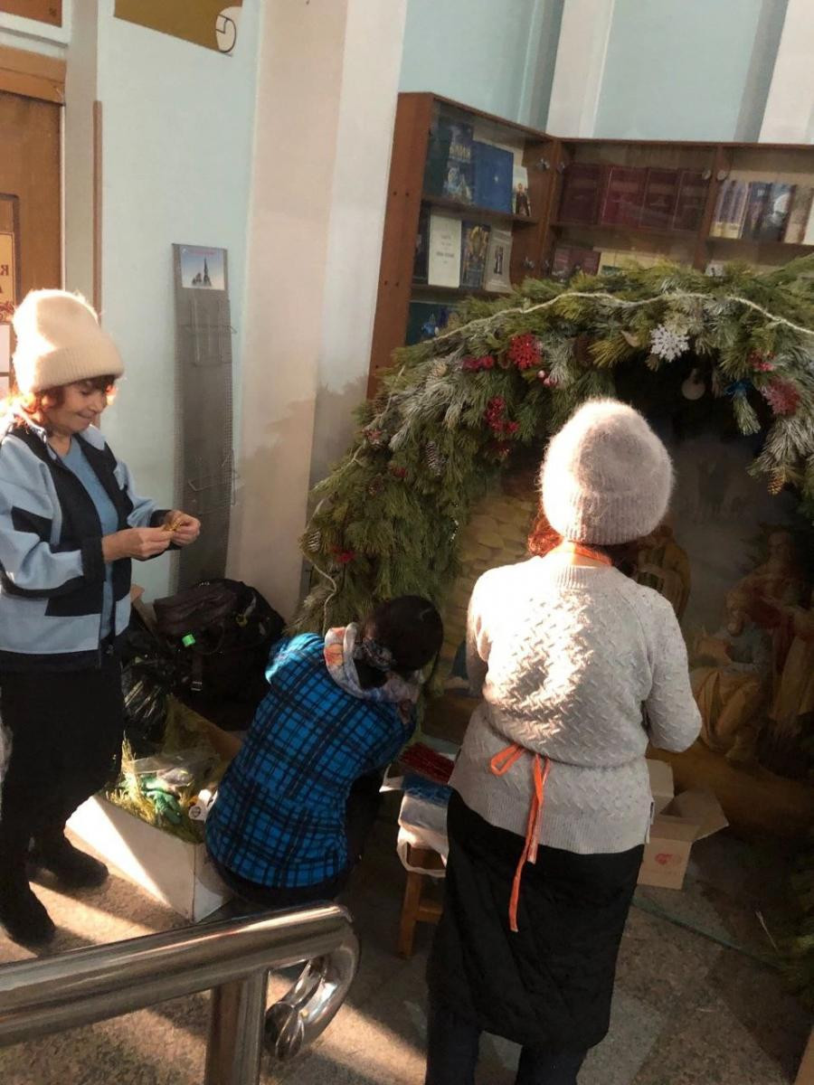 В эти предпраздничные дни отделение флористики проекта Читинской епархии «Традиции церковного искусства» (руководитель Белая Гульнара Аманмурадовна) вместе с верующими – прихожанами собора – они превращали величественное здание в сказочное воплощение Рождественской истории.