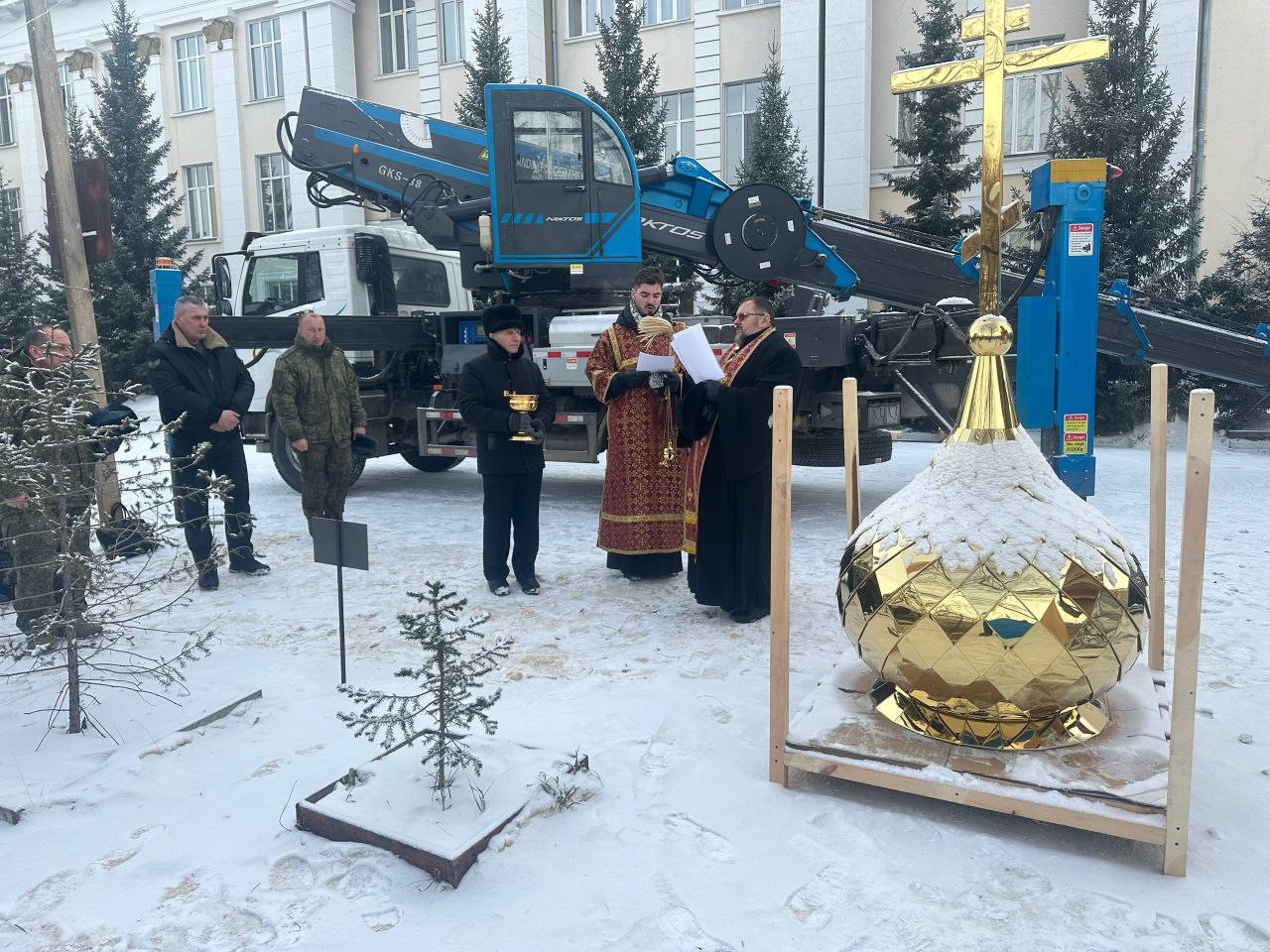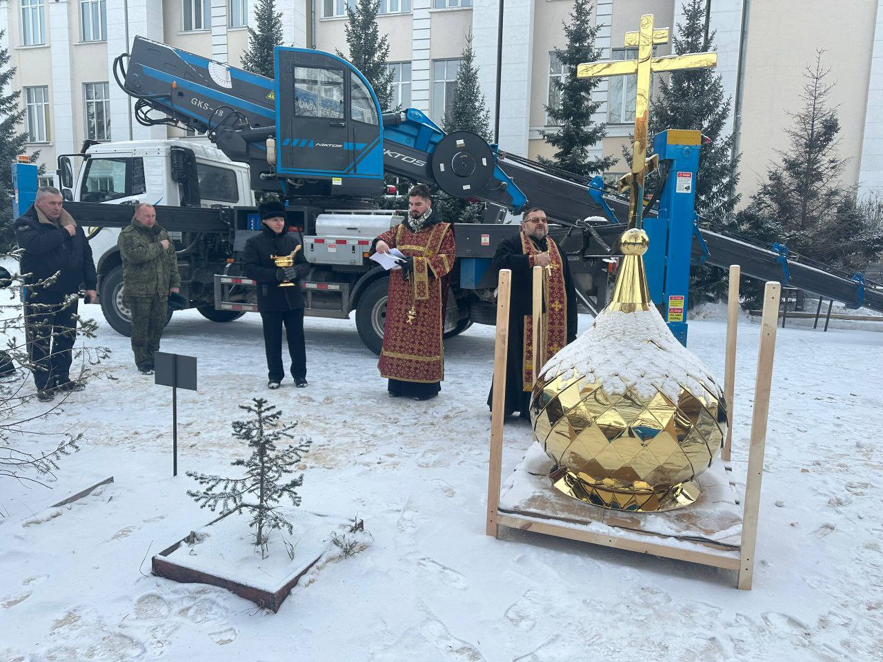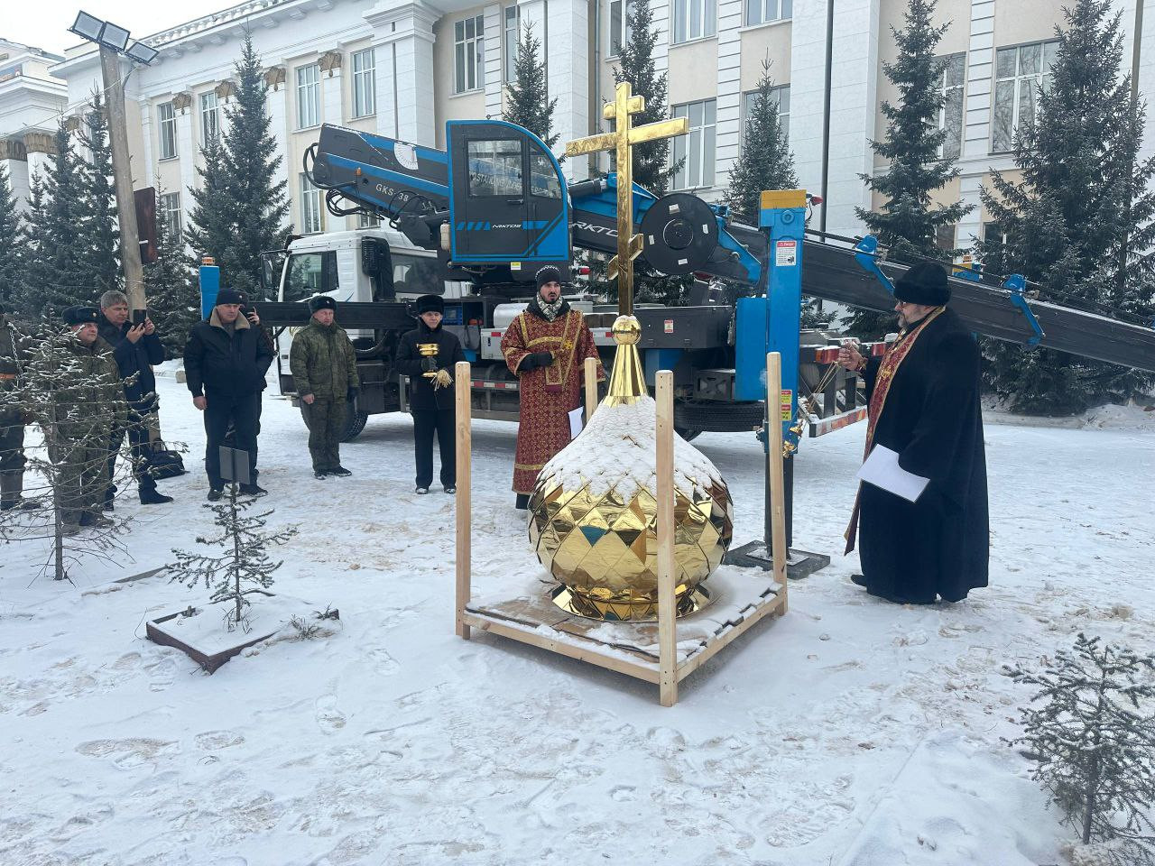 После завершения чина освящения, купол с крестом был поднят и установлен на часовню.