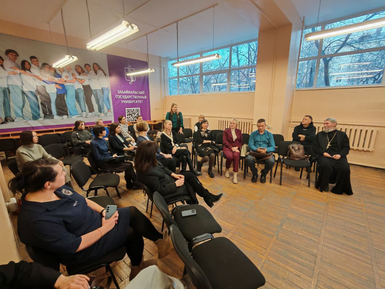 8 декабря 2025 года, руководитель Отдела религиозного образования и катехизации Читинской епархии, Русской Православной Церкви - протоиерей Павел Матвеев и заместитель Отдела Сергей Сергеевич Медведев, посетили Забайкальский государственный университет. Беседа прошла по теме духовно-нравственного воспитания преподавателя и его роль в сохранении русской идентичности.