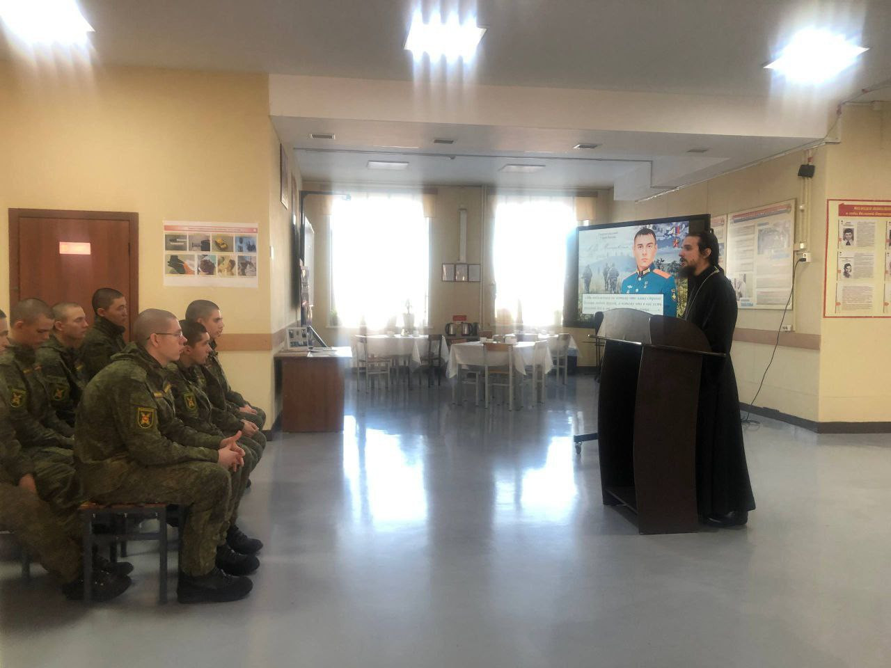 Священник обсудил с солдатами, кого можно назвать героем, какие героические поступки можно встретить в мирной жизни, какие подвиги мы можем совершать в семейной и в своей личной духовной жизни. Было отмечена важность делания добрых дел не на показ и не за награды.