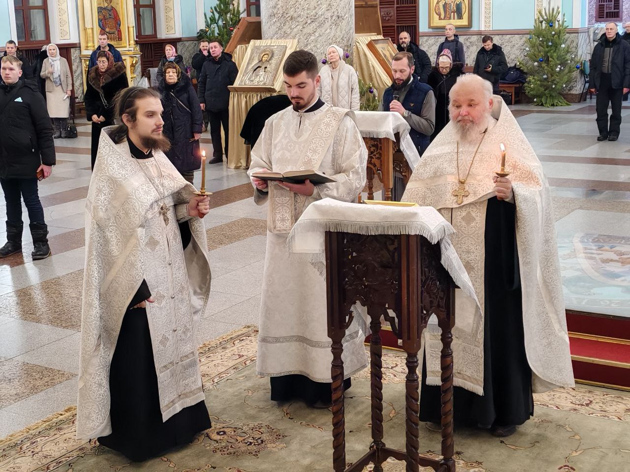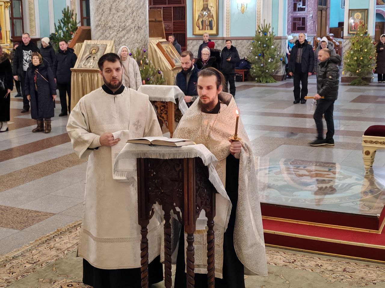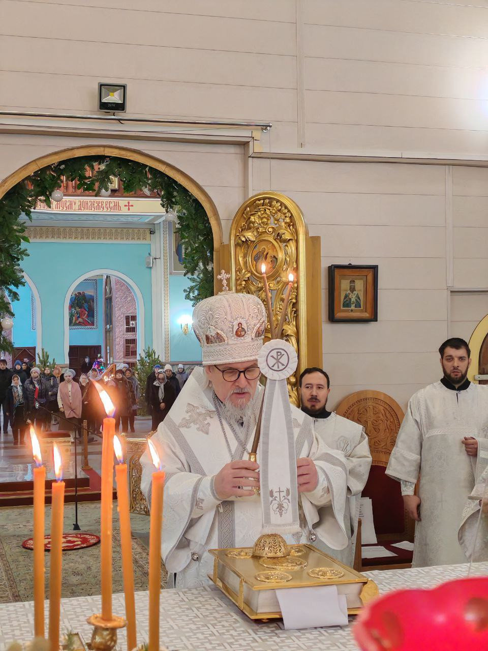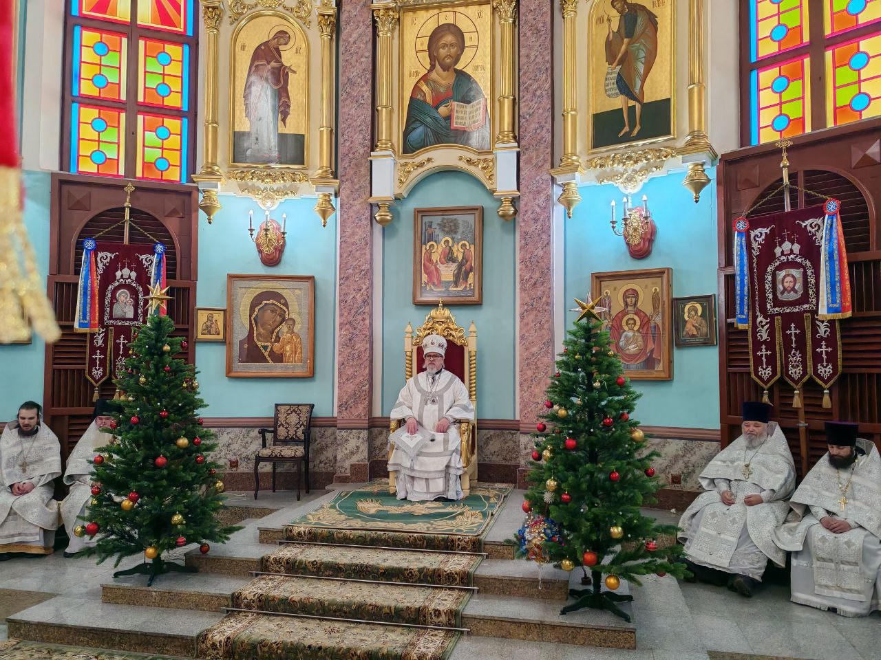 6 января 2026 года, навечерие Рождества Христова (Рождественский сочельник). День памяти первомученницы Евгении. Митрополит Читинский и Петровск-Забайкальский Димитрий совершил великую вечерню, с чтением паримий праздника и Божественную литургию святителя Василия Великого в кафедральном соборе Казанской иконы Божией Матери города Читы.