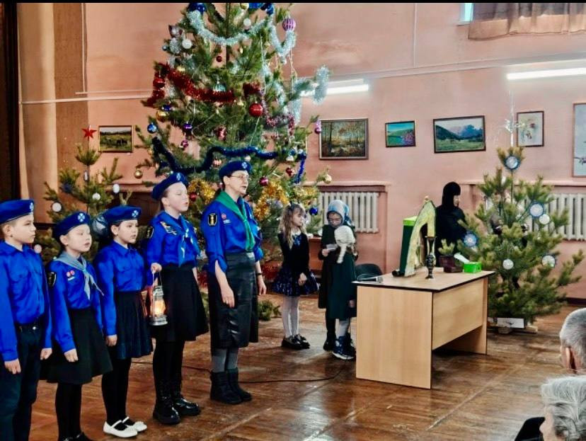 Православные следопыты из отряда имени цесаревича Алексия рассказали о Вифлеемском огне, передали его участникам встречи и исполнили рождественские колядки.