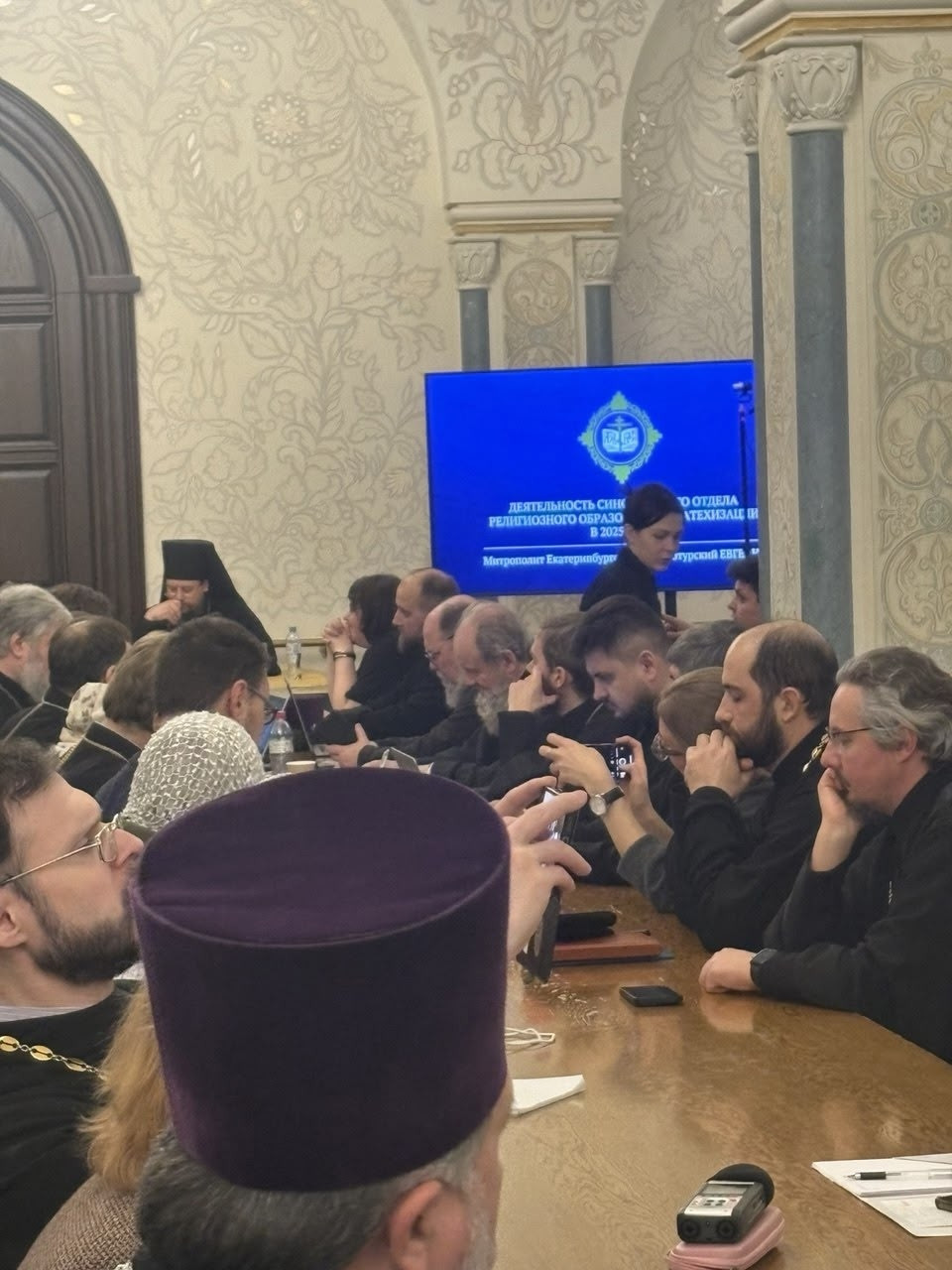 Митрополит Екатеринбургский и Верхотурский Евгений, председатель Синодального отдела религиозного образования и катехизации подвёл итоги деятельности и наметил перспективы развития образовательной и просветительской деятельности. Вначале он подвёл итоги предыдущих Рождественских чтений. Освещая вопрос о работе Воскресных школ было отмечен рост числа обучающихся. Обращая внимание на проведение педагогических конкурсов, владыка отметил снижение числа участников конкурса «За нравственный подвиг учителя», которое произошло на фоне увеличения педагогов, принимавших участие в конкурсе Клевер ДНК. По традиции большое внимание было уделено проблемам изучения Основ Православной культуры в средней школе. Главным событием здесь стало возвращение в программу школы предмета Духовно- нравственная культура Россиикоторый будет изучаться в 5- 7 классах. Владыка отметил, что важнейшим инструментом подготовки педагогических кадров и методической поддержки учителей является платформа Клевер лаборатория. Митрополитом Евгением также были озвучены ряд других вопросов религиозного образования и катехизации. Также на совещании выступили руководители основных секций Синодального отдела. В работе совещания приняли участие председатель Отдела религиозного образования и катехизации Читинской епархии протоиерей Павел Матвеев и руководитель Отдела Нерчинской епархии протоиерей Андрей Кисов.