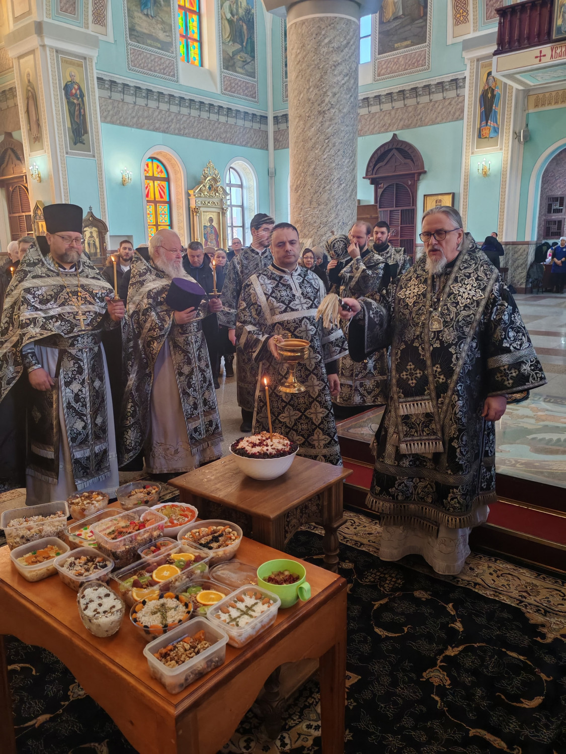 По заамвонной молитве был совершен молебен великомученику Феодору Тирону, в завершении которого была прочитана молитва на освящение колива.
