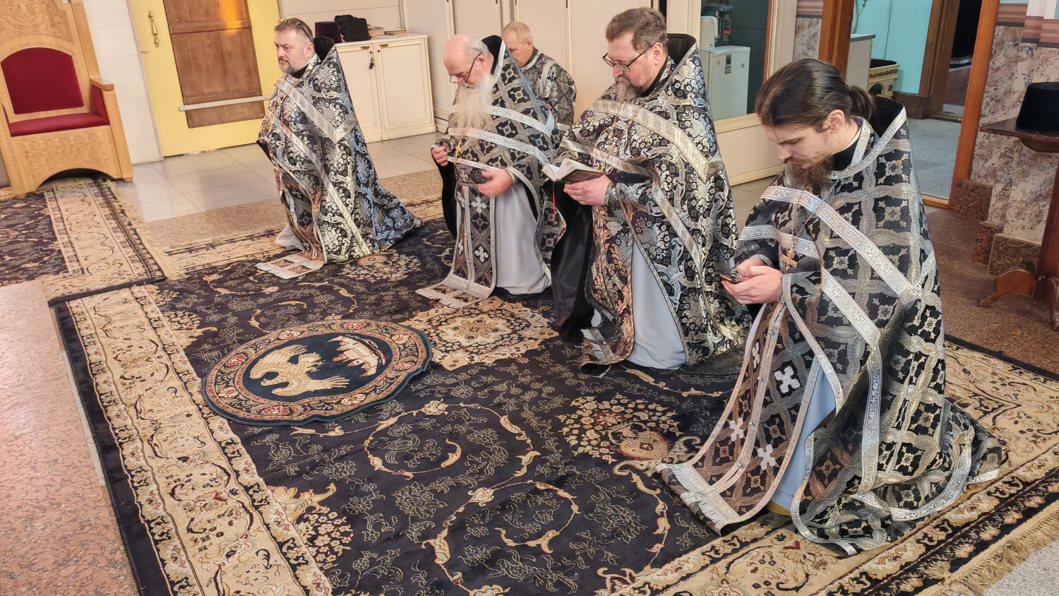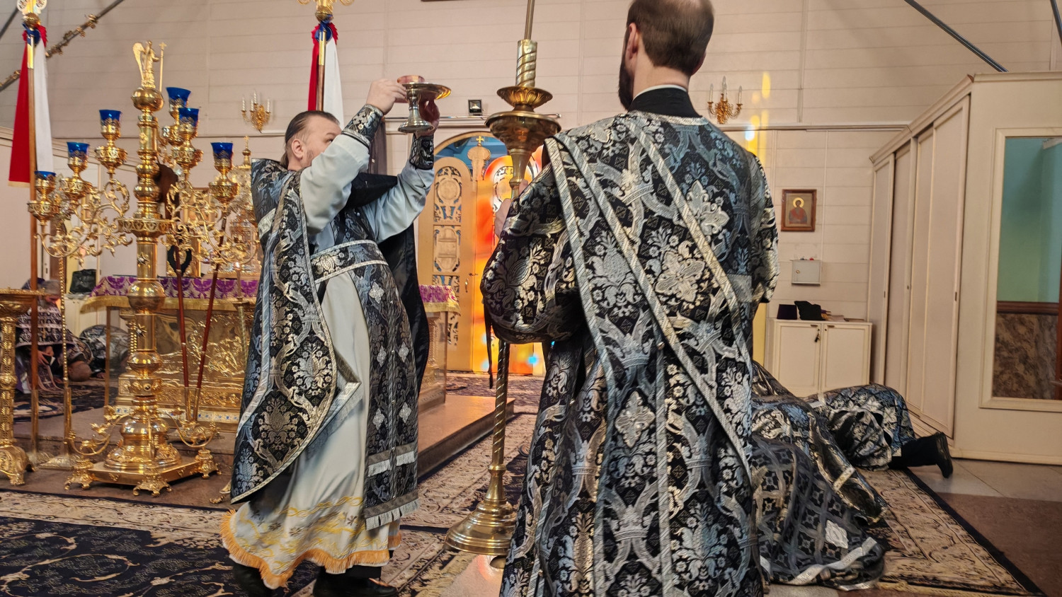 Перед Литургией были совершены уставные великопостные богослужения — часы, изобразительны и вечерня.