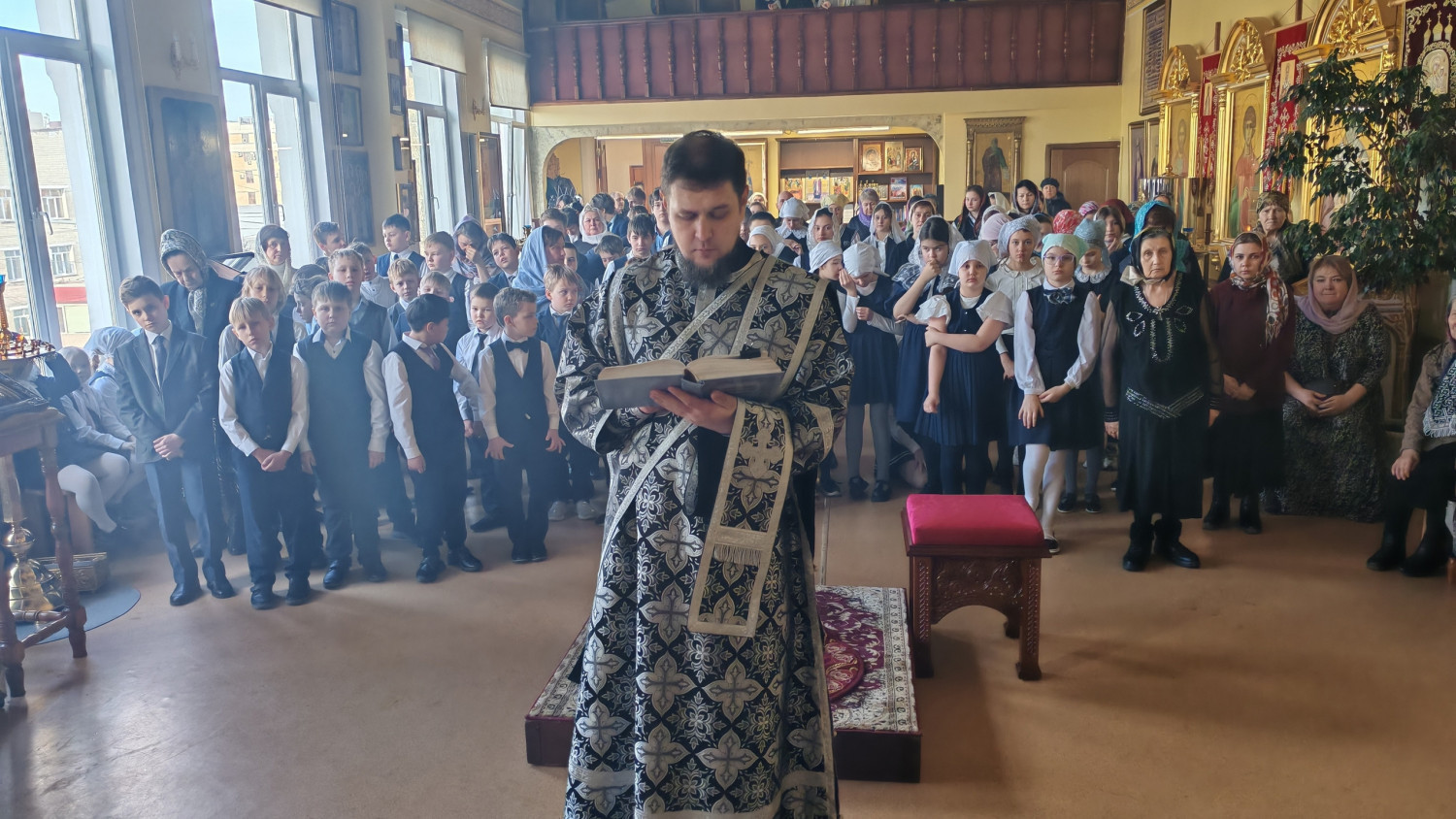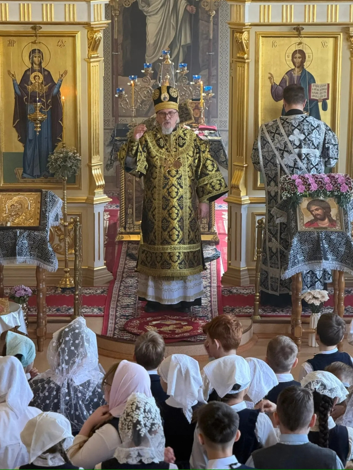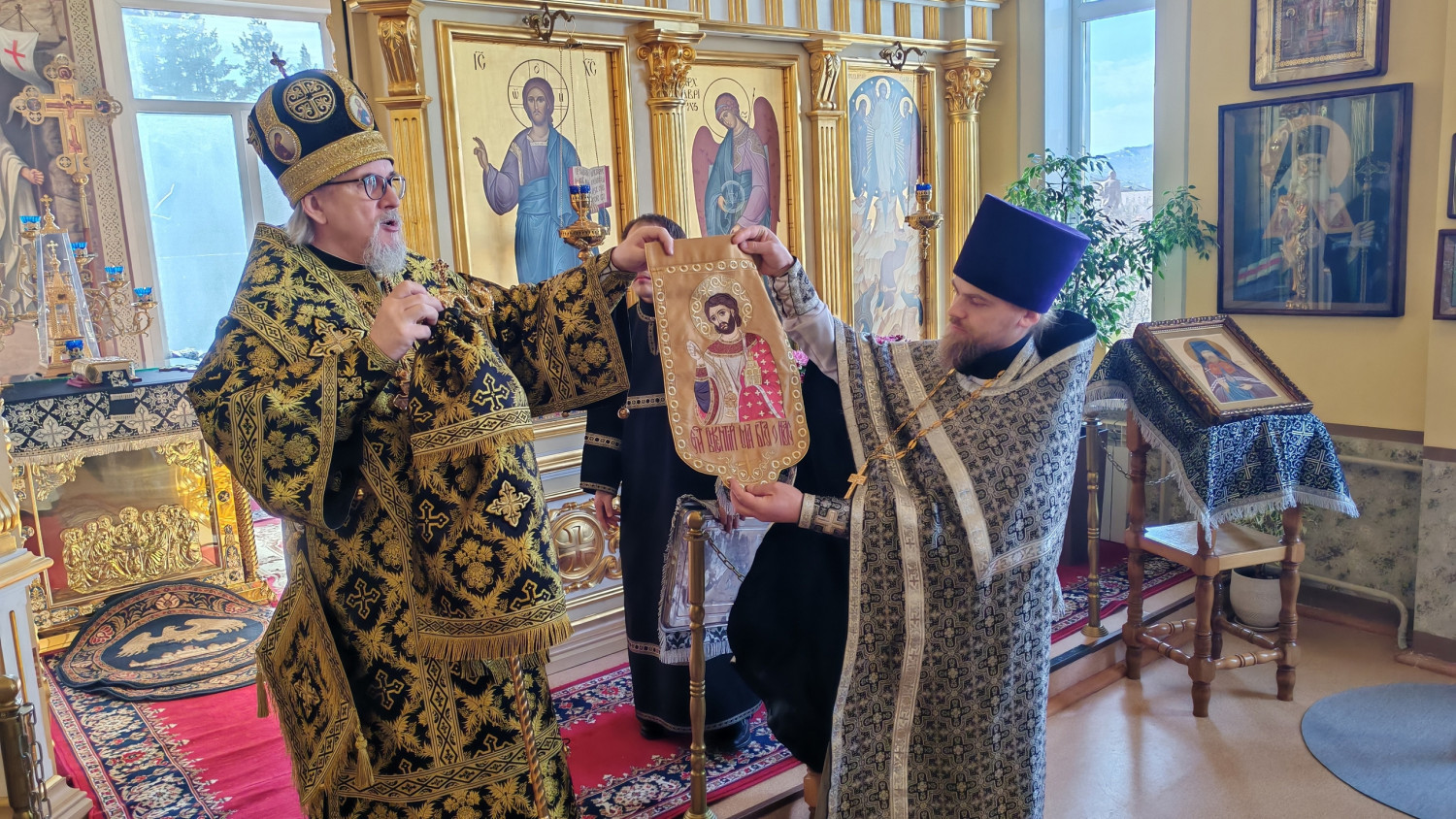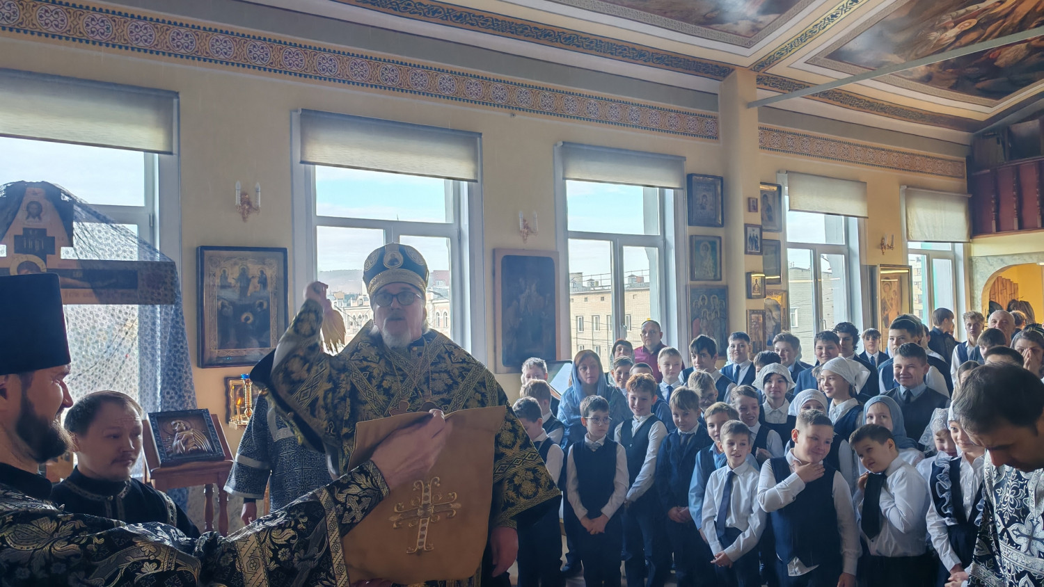 По окончании богослужения, Глава Забайкальской митрополии обратился ко всем молящимся с архипастырским словом назидания и подарил приходу и гимназии хоругвь с ликом мученика Викентия.