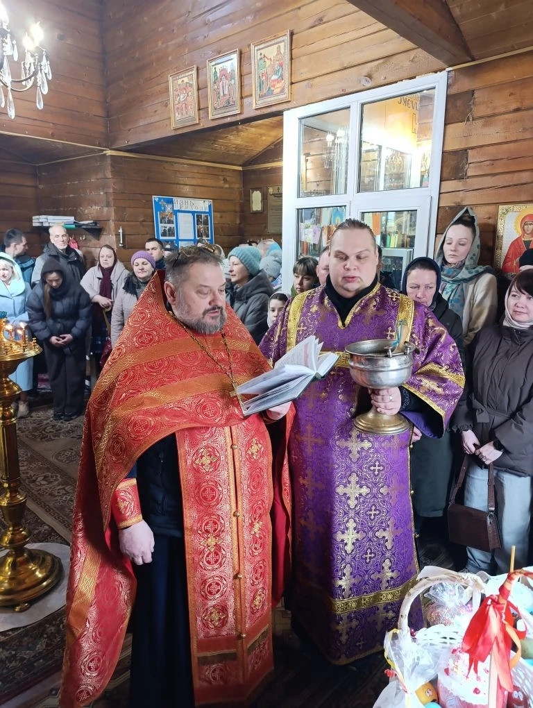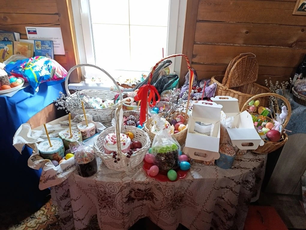 Отец Михаил зачитал поздравление Святейшего Патриарха Московского и всея Руси Кирилла, после чего по сложившейся благочестивой традиции освятил пасхальную снедь — куличи, яйца и творожные пасхи.